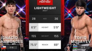 トフィックムサエフ・ムサエフ(Tofiq Musayev)身長178cm, 体重70kg,アゼルバイジャン出身, 36歳,空手とかレスリングとか.ライト級圏外.vs.イグナシオ・バハモンデス(Ignacio Bahamondes)身長191...