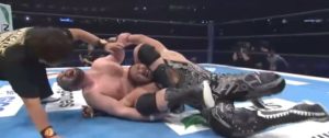 恐れていたのは柔道技に逃げることだったのですが、最後のサブミッション(上掲画像)に移行する前の腕ひしぎが柔道っぽくて嫌だったのを除けば、概してアーロンウルフはプロレスをやっていたと思います。