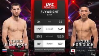 堀口恭司(Kyoji Horiguchi),身長165cm, 体重57kg,伝統空手(松濤館)黒帯2段,フライ級デビュー戦, 35歳.vs.タギールウランベコフ(Tagir Ulanbekov)身長170cm, 体重57kg,サンボ,ハビブ...