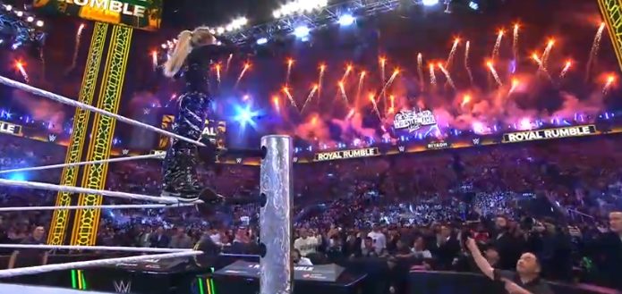 優勝したリブモーガンがWrestleManiaの看板を指差すポーズを忘れて