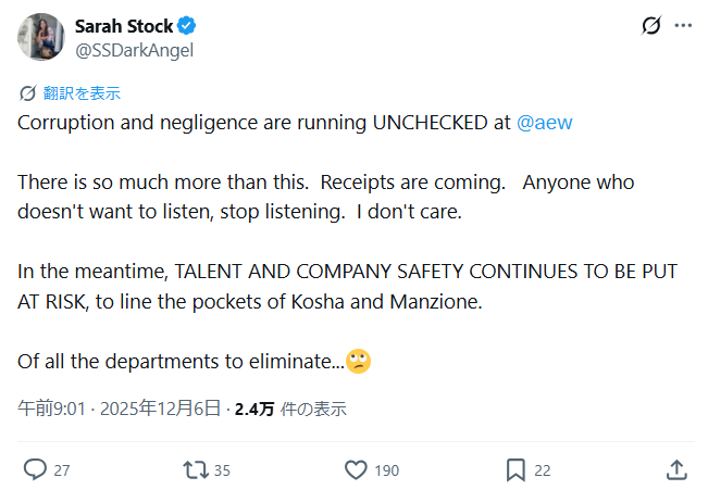 There is so much more than this. Receipts are coming. Anyone who doesn’t want to listen, stop listening. I don’t care. In the meantime, TALENT AND COMPANY SAFETY CONTINUES TO BE PUT AT RISK, to line the pockets of Kosha and Manzione. Of all the departments to eliminate…出典:サラストックTwitter(X)ここ