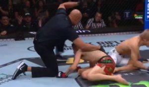 平良達郎がモレノに足を引っかける形でテイクダウンを取り